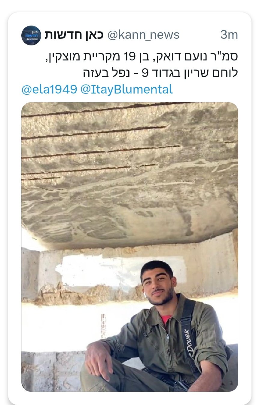أكدت وسائل عبرية، مقتل الرقيب نوعام دويك 19 عاما من كريات موتسكين، وهو مقاتل في سلاح المدرعات في الكتيبة التاسعة تشكيل "أعقاب الفولاذ" (401)، سقط في معركة في جنوب قطاع غزة.