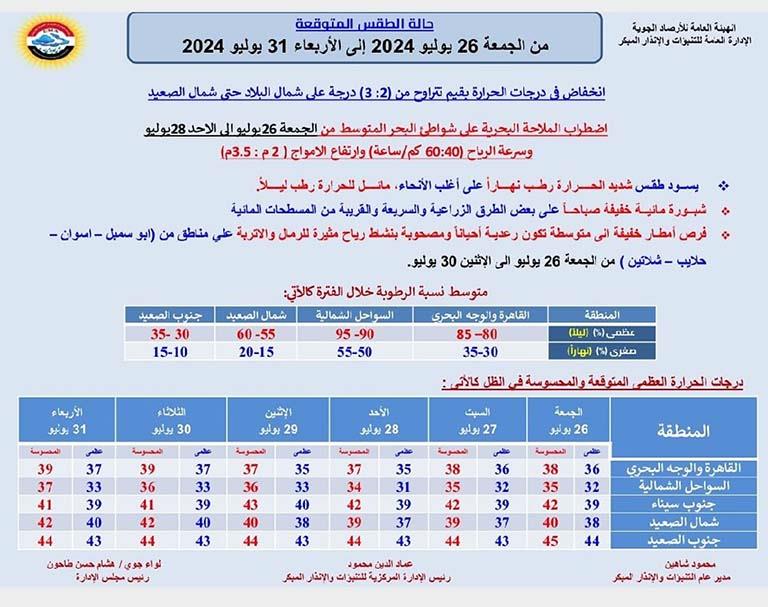 من المتوقع أن يسود طقس شديد الحرارة رطب نهارًا على أغلب الأنحاء مائل للحرارة رطب ليلًا إضافة إلى شبورة مائية خفيفة صباحًا على الطرق الزراعية والقريبة من المسطحات المائية.