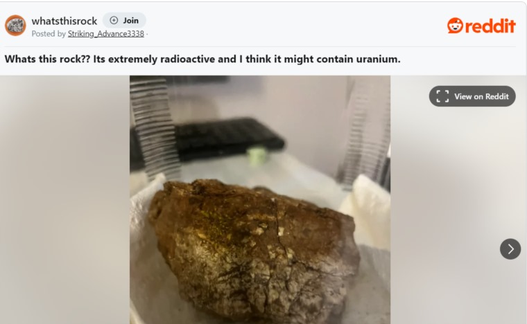 وطلب غاريت تنس البالغ من العمر25 عاماً من خلال منشور عبر منصة "ريديت"، المساعدة في كشف طبيعة هذه الحجر الذي يشع في الظلام والذي عثر عليه والده داخل "منجم روجلز"، في مدينة "نيو هامبشاير"، حين كان يبلغ 12 عاماً.