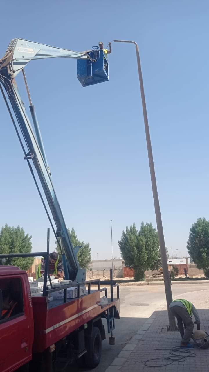 ووجه رئيس الجهاز، بسرعة استخدام جميع المعدات اللازمة للتركيب عدد ۲ باسكت ولودر وتغير الأسلاك التالفة واستخدام باسكت ثالث لدهان الأعمدة بجميع مناطق المدينة لإظهار الشكل الجمالي من دهان أعمدة وكشافات الليد .