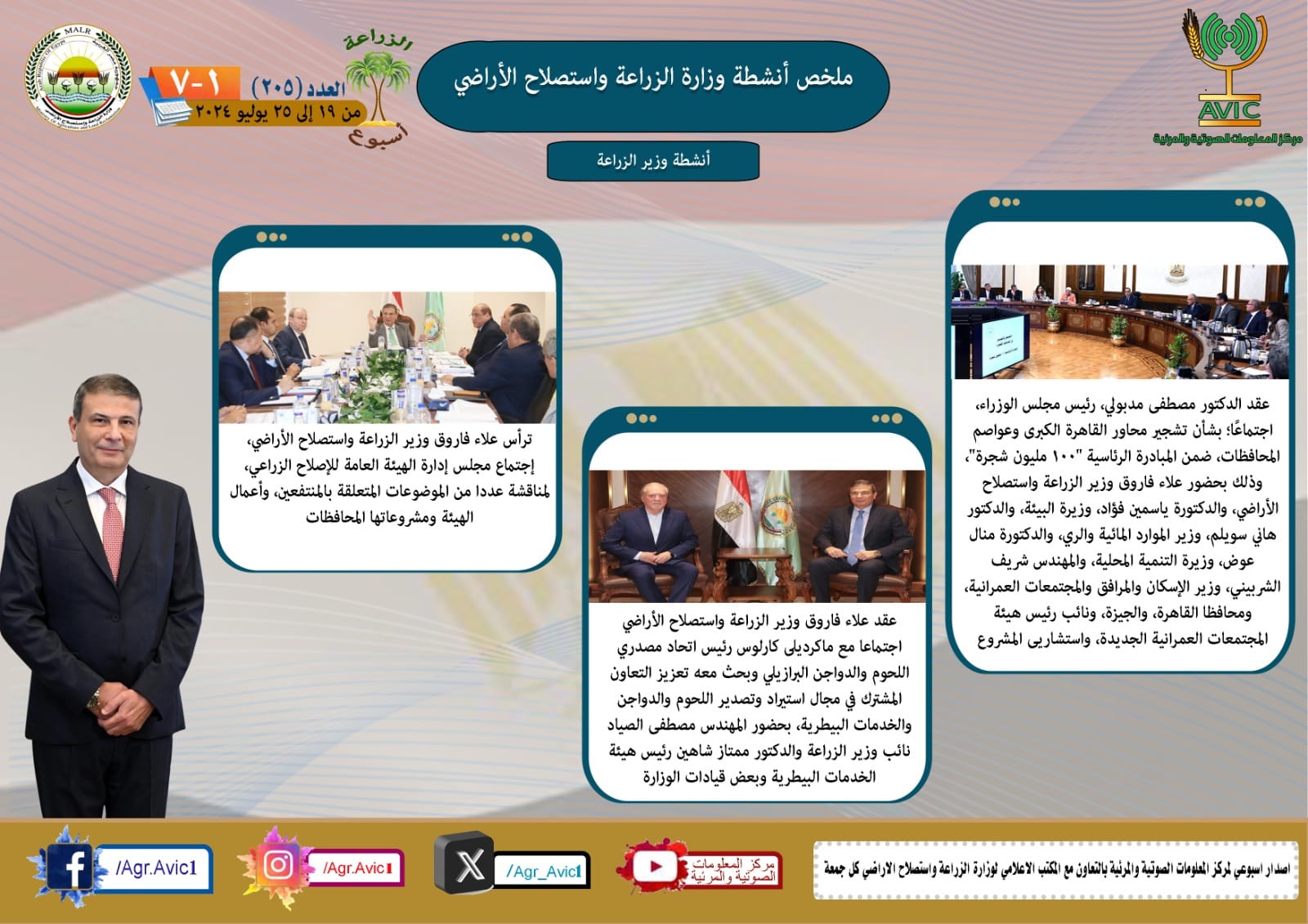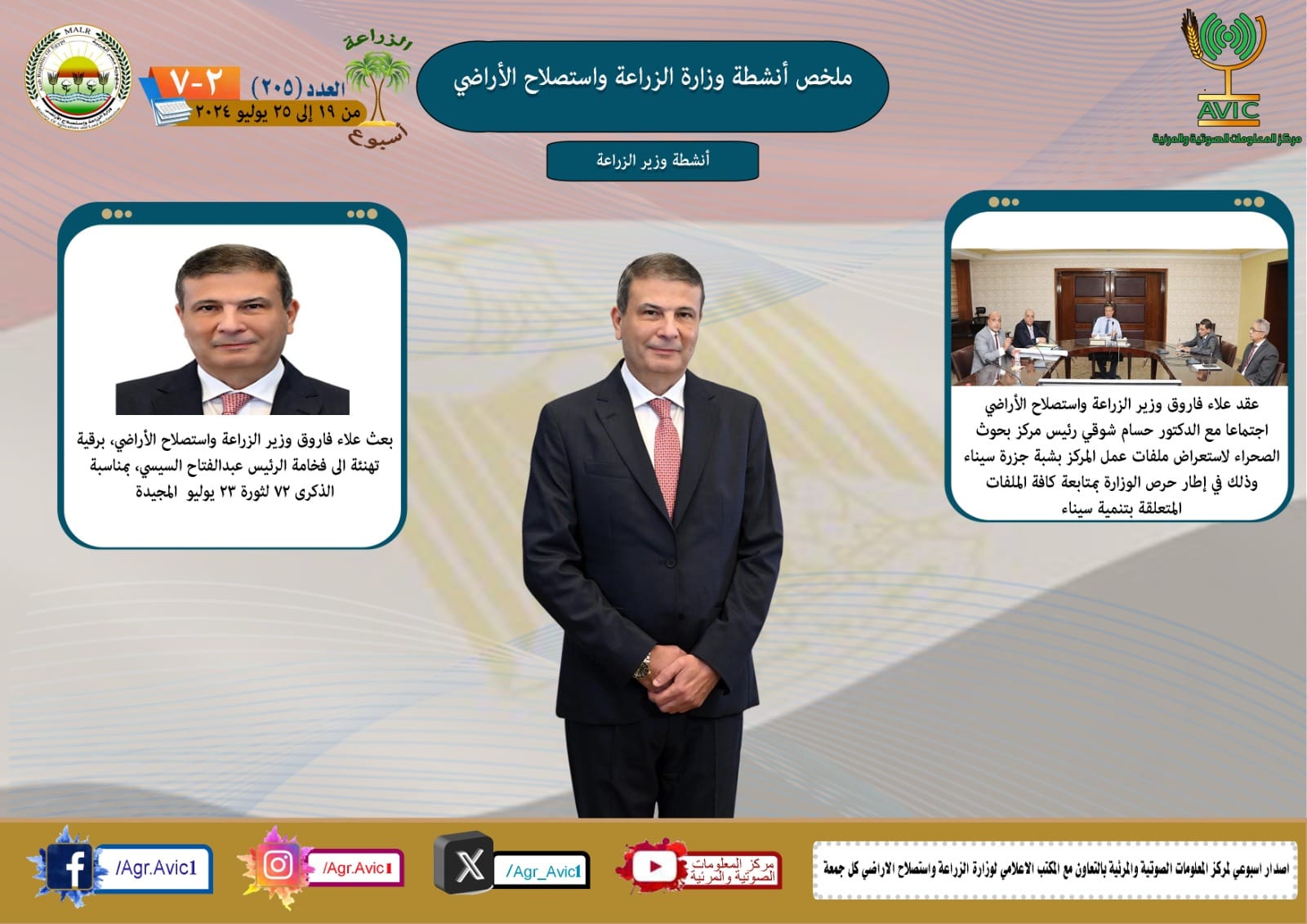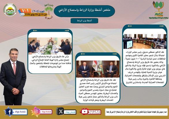 أصدر مركز المعلومات الصوتية والمرئية، التابع لوزارة الزراعة واستصلاح الاراضي، "الانفوجراف الاسبوعي" في نسخته رقم ٢٠٥ حول الحصاد الأسبوعي لأهم أنشطة الوزارة، خلال الاسبوع الماضي في الفترة من ١٩ وحتى ٢٥  يوليو  الجاري، وذلك بالتعاون مع المكتب الاعلامي للوزارة، كما أصدر المركز ايضا ملخصا بالفيديو، حول انشطة الوزارة خلال نفس الفترة.
