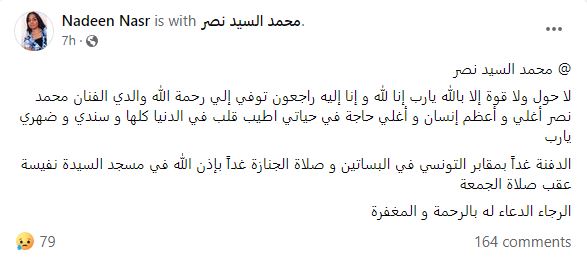 وتابعت: "الدفنة بمقابر التونسي في البساتين وصلاة الجنازة بإذن الله في مسجد السيدة نفيسة عقب صلاة الجمعة، الرجاء الدعاء له بالرحمة والمغفرة".