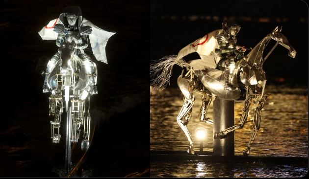 ظهرت فارسة تركب جوادها المعدني اللامع فوق مياه نهر السين، مرتدية عباءة مزينة بالحلقات الأوليمبية. وبينما كانت تمر تحت الجسور المتعاقبة في باريس، كانت أجنحة الحصان المعدني المجنح تنطلق لترمز إلى رسالة السلام.