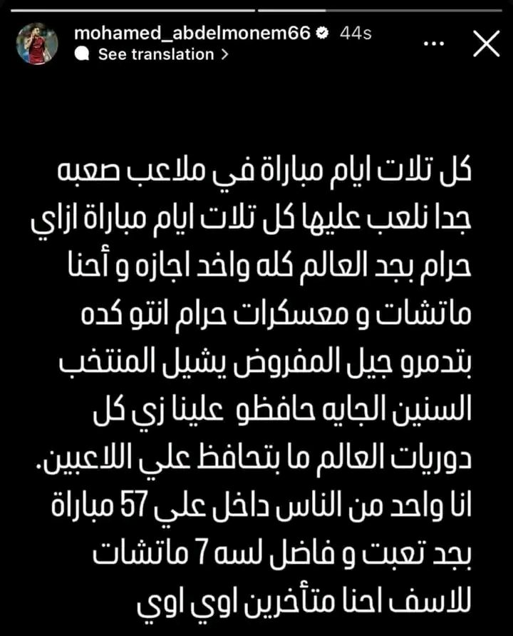 وكتب محمد عبد المنعم رسالة عبر حسابه الشخصي بموقع "انستجرام"، حيث قال: “كل ثلاث أيام مباراة في ملاعب صعبة جدا نلعب عليها كل ثلاث أيام مباراة ازاي حرام".