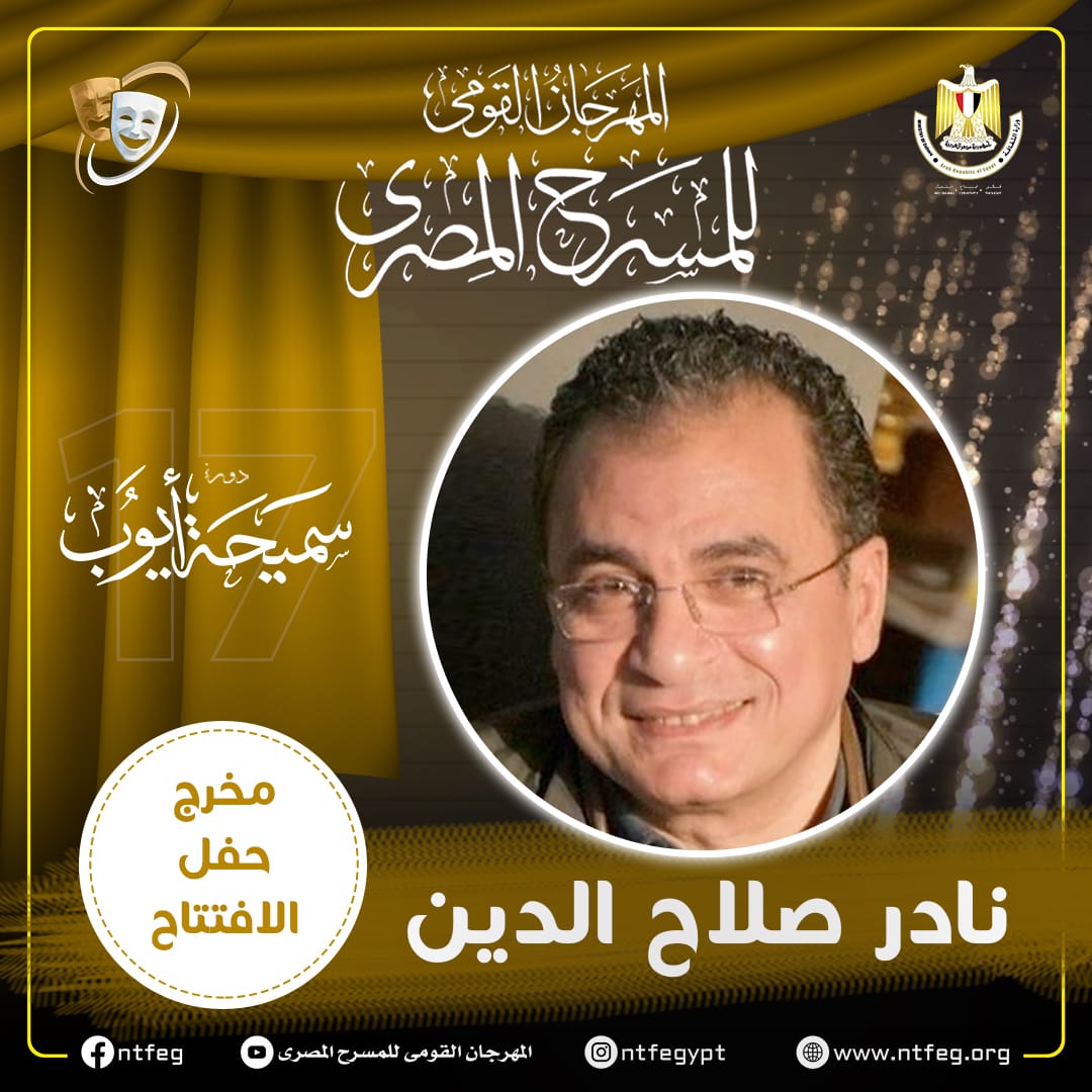 اختارت إدارة مهرجان المسرح المصري، برئاسة الفنان محمد رياض، المخرج نادر صلاح الدين لإخراج حفل افتتاح الدورة السابعة عشرة، والتي تحمل اسم سيدة المسرح العربي الفنانة القديرة (سميحة أيوب) والتي من المقرر أن تنطلق يوم الثلاثاء الموافق 30 يوليو وتستمر حتى 17 أغسطس 2024.