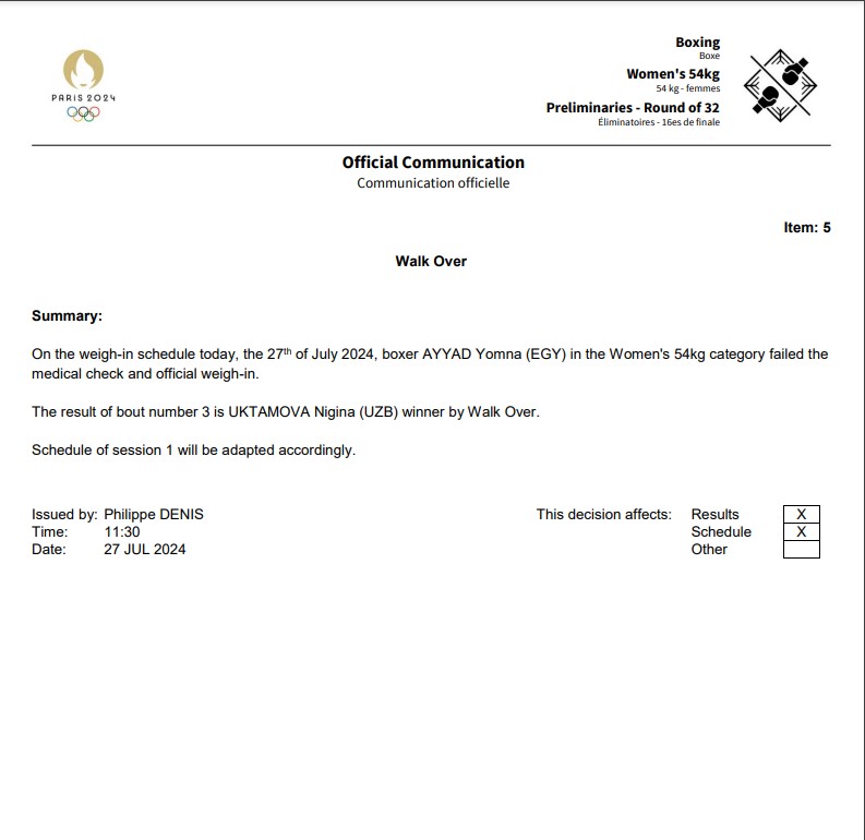 واستبعدت يمنى عياد من منافسات وزن 54 كجم بدورة الألعاب الأولمبية باريس 2024  ودا بعد فشلها في اجتياز الكشف الطبي و الميزان  قبل انطلاق المنافسات .