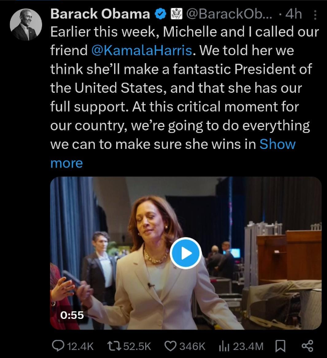 وقال أوباما عبر صفحته الشخصية بموقع التواصل الإجتماعي تويتر: “ اتصلنا أنا وميشيل في مطلع الأسبوع بصديقتنا كامالا هاريس. قلنا لها إننا نعتقد أنها ستكون رئيسة ممتازة للولايات المتحدة، وإنها تحظى بدعمنا الكامل ”.