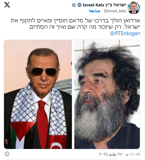 إسرائيل تشبة أردوغان بـ صدام حسين بعد تهديدة بالحرب معها