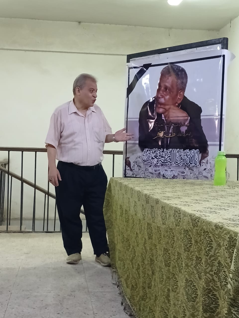 بداية ألقى الشاعر محمد عبيد قصيدة رثاء أهداها لروح الراحل، لتنتقل الكلمة إلى المترجم والمبدع أسامة الجوهرى ثم للشاعرة نجاح على أقدم الاعضاء المؤسسين وأول رئيس لمجلس الإدارة للنادى، لتنتقل الكلمة بعد ذلك للشاعر مجدى أبو الخير الذى افتتح كلمته بالتأكيد على أننا نتكامل وأننا أسرة واحدة وأن الإنسانية هى الأبقى وأن المبدع لن يموت وسيظل إبداعه يحيا.
