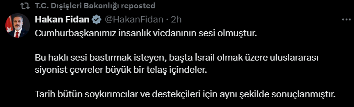 وقالت وزارة خارجية تركيا عبر صفحتها الرسمية بمنصة X : “لقد أصبح رئيسنا صوت الضمير الإنساني، إن الأوساط الصهيونية العالمية، وخاصة إسرائيل، التي تريد قمع هذا الصوت الحق، تشعر بقلق بالغ”.