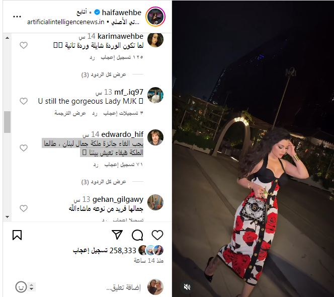 تفاعل النجمة اللبنانية هيفاء وهبي مع أحدث صيحات إطلالاتها الساحرة المستوحاه من أشهر دور الأزياء العالمية، جاءت التعليقات مؤيده لجمالها وإطلالتها، رصدنا أبرزها: " لما تكون الوردة شايلة وردة تانية، يجب الغاء جائزة ملكة جمال لبنان ، طالما الملكة هيفاء تعيش بيننا، جمالها فريد من نوعه ماشاءالله، قمر ديمشي على الارض الغزل القديم".