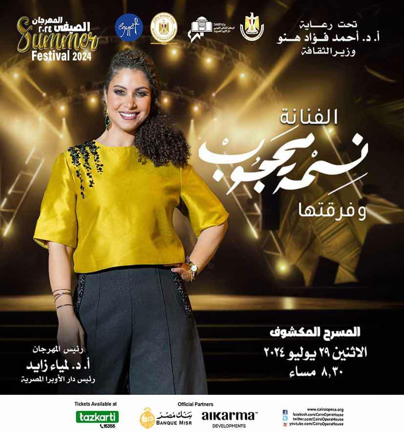 تواصل دار الأوبرا المصرية برئاسة الدكتورة لمياء زايد، فعاليات مهرجانها الصيفى، تقدم حفلا للفنانة نسمة محجوب وفرقتها وذلك في الثامنة والنصف مساء اليوم، الاثنين، على المسرح المكشوف، تحت رعاية الدكتور أحمد فؤاد هنو وزير الثقافة.
