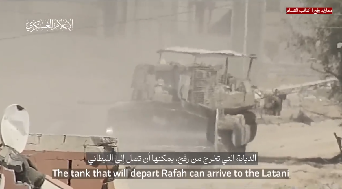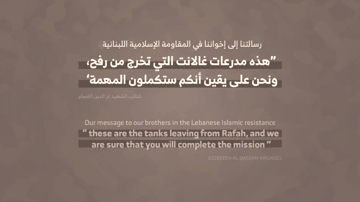 وجه الإعلام العسكري لكتائب القسام، رسالة إلى المقاومة الإسلامية في لبنان، من خلال مقطع فيديو بعنوان " هذه مدرعات غالانت التي تخرج من رفح، ونحن على يقين أنكم ستكملون المهمة، كتائب الشهيد عز الدين القسام".