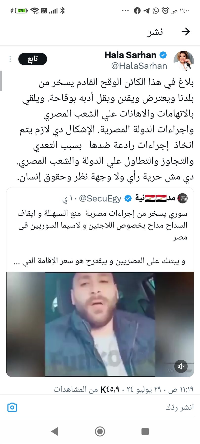 بلاغ ضد سوري يهاجم الشعب المصري وينتقد قرارات الحكومة وهالة سرحان تعلق