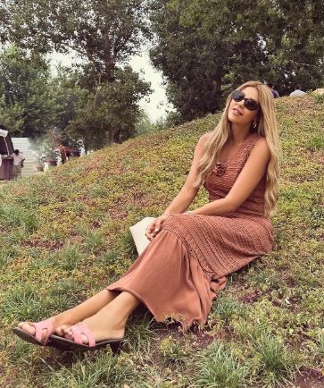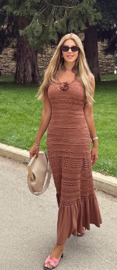 وبدت كارلا حداد بإطلالة صيفية جذابة، حيث ارتدت فستان طويل مجسم، بدون أكمام، صمم من قماش مجعد مزين خيوط ناعم باللون البني لانه من أحدث الصحيات الرائجة في فساتين صيف 2024، والفستان عكس قوامها الرشيق.