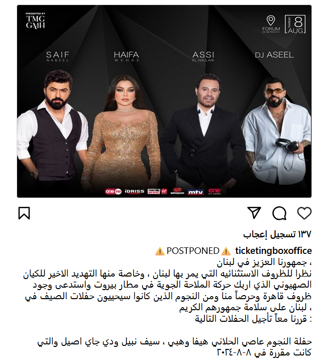 قررنا معاً تأجيل الحفلات التالية: حفلة النجوم عاصي الحلاني هيفا وهبي، سيف نبيل ودي جاي اصيل والتي كانت مقررة في ٨-٨-٢٠٢٤
