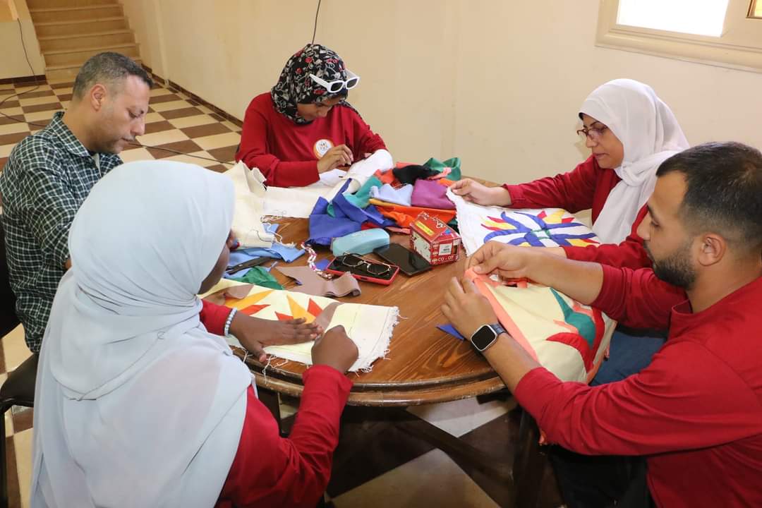 أما ورشة الخيامية للمدرب عماد عاشور، شهدت تعريف المتدربين بكيفية الخياطة بالغرزة السحرية، وتنسيق الألوان.