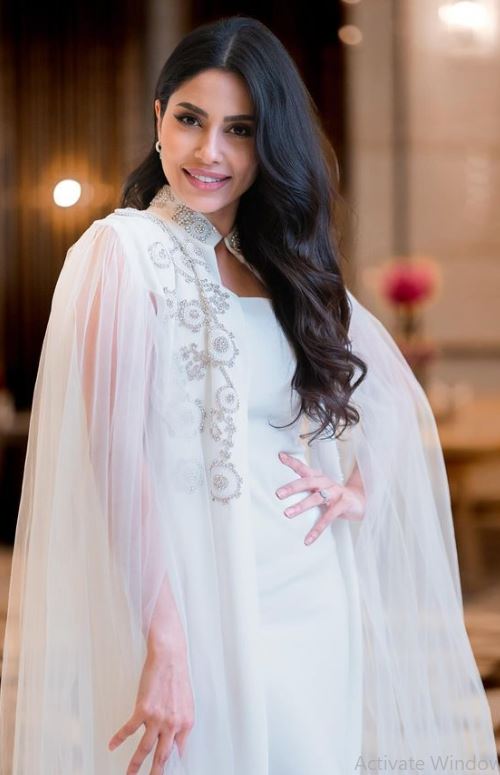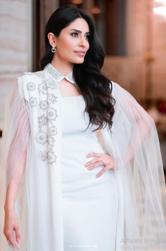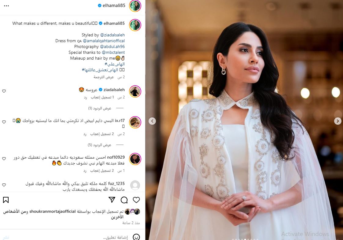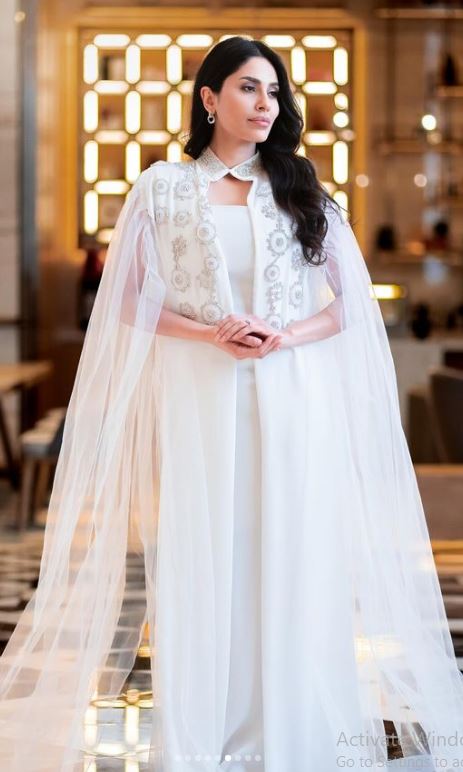 وبدت إلهام علي بإطلالة ملائكية، مفعمة بالاحتشام والجاذبية في آن واحد، حيث ارتدت فستان طويل وعليه كاب صمم من الحرير، وعكس اللون الأبيض صفاء ونقاء ذوقها.