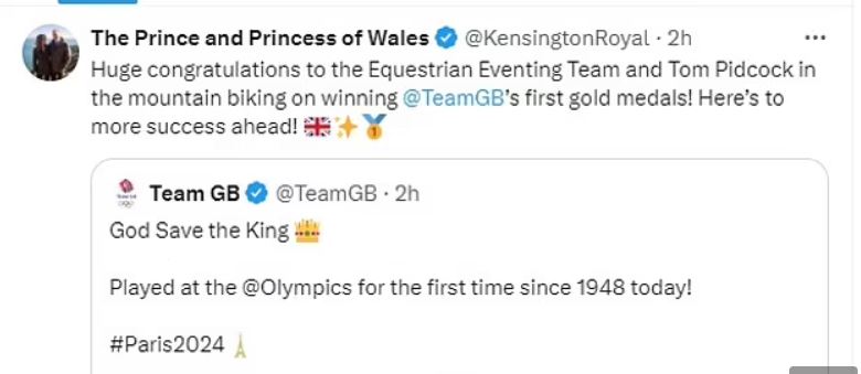 كما فازت لورا كوليت أيضًا بالميدالية البرونزية في مسابقة الفروسية الفردية، ونشر الأمير ويليام عبر حسابه الرسمي وزوجته على موقع X ، تويتر سابقً: "تهانينا الحارة لفريق الفروسية وتوم بيدكوك في سباقات الدراجات الجبلية على الفوز بأول ميداليات ذهبية لفريق @TeamGB!وأردف عبر المنشور: "نأمل في المزيد من النجاح في المستقبل!"