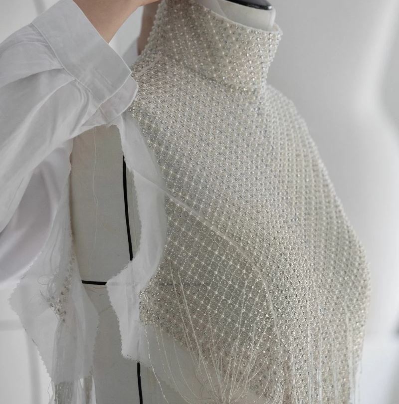 وطُرّز الفستان بأكثر من 500 متر من القماش المرصّع بالكامل بآلاف حبّات الخرز الفضي، من القبّة مروراً بالصدر وصولاً الى الجزء السفلي الذي جاء على شكل تنورة واسعة، مزيّنة بسلاسل مطرّزة بالخرز الفخم.