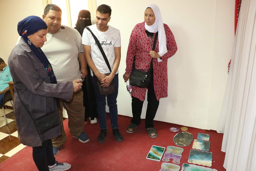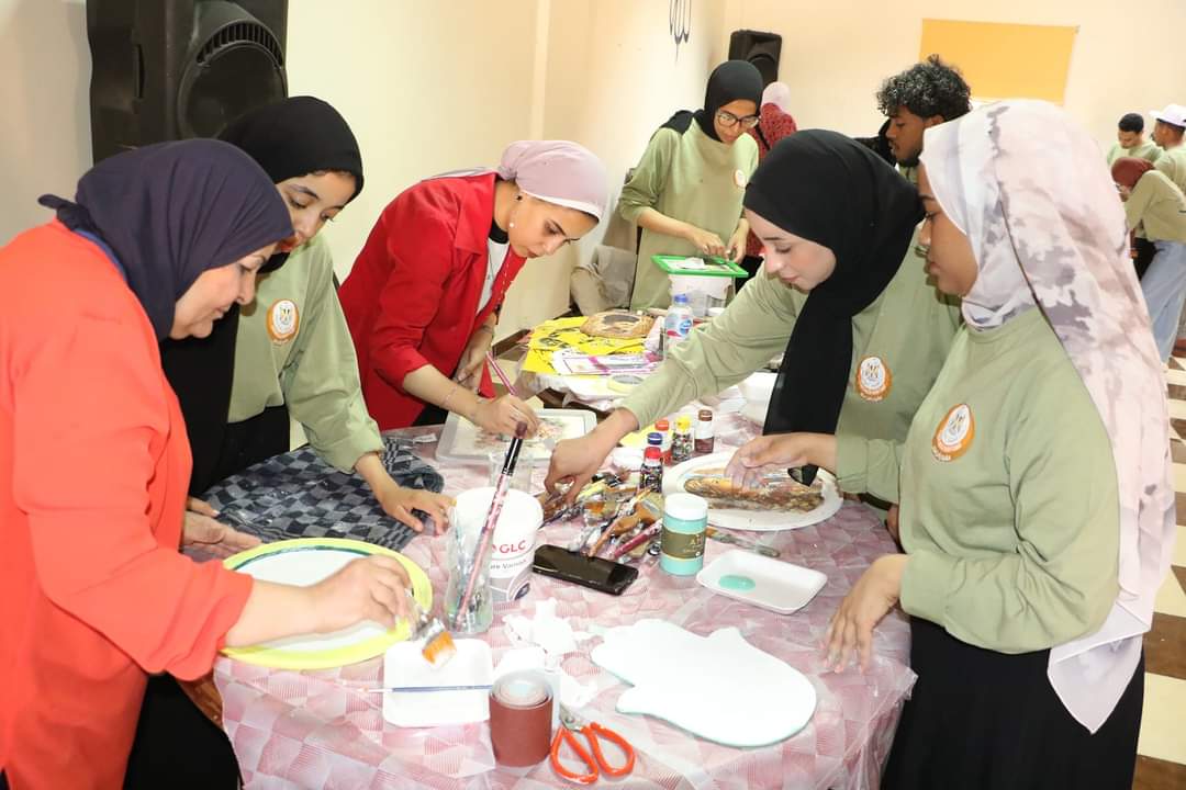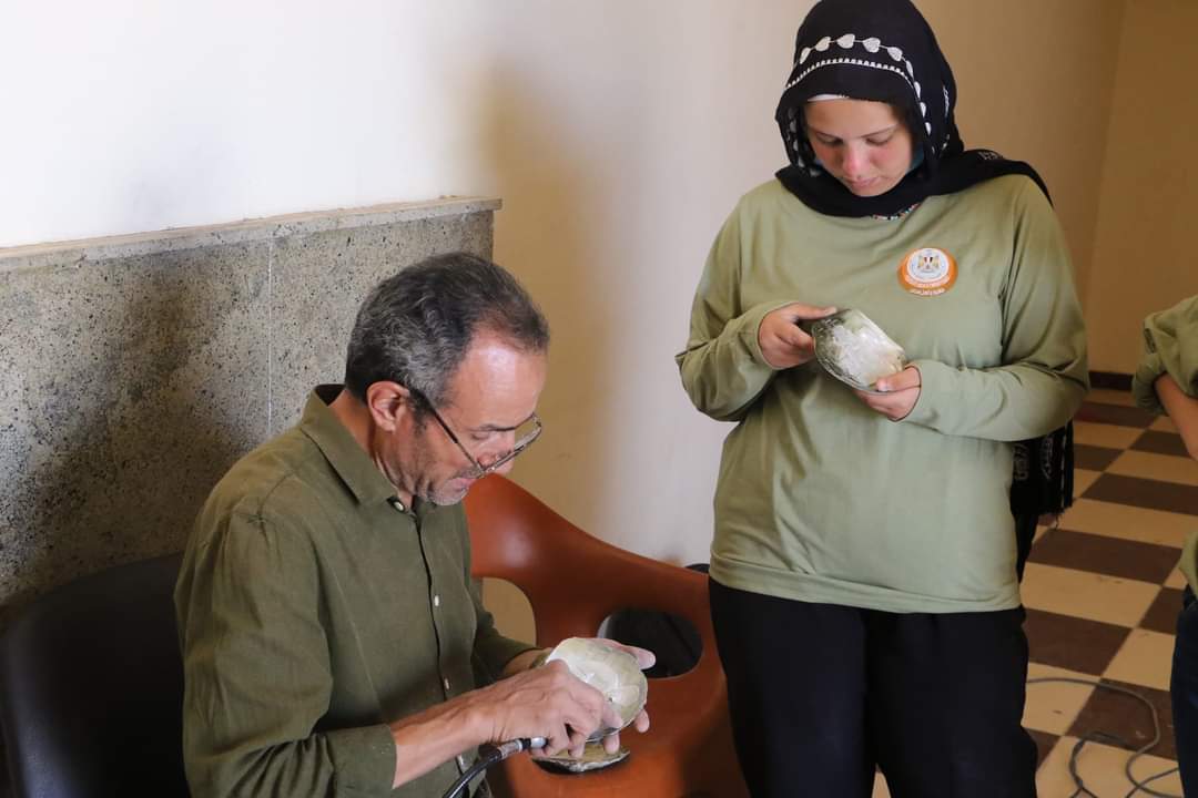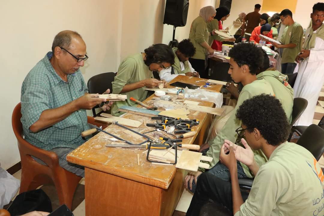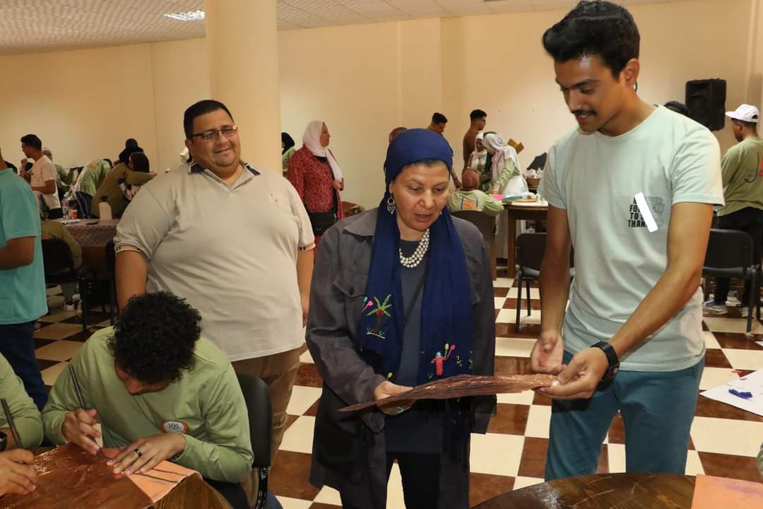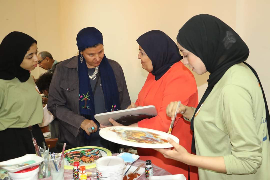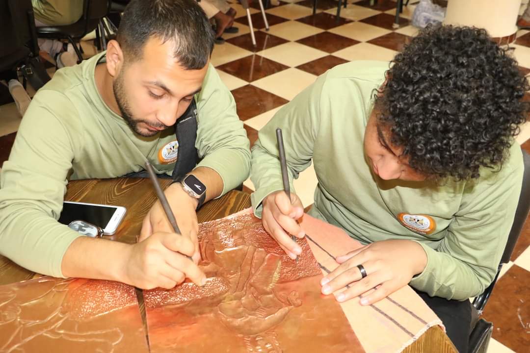 كما شهدت ورشة الرسم على الصدف للمدرب جلال عبد الخالق تدريب الشباب على تصميم أعمال مرتبطة بالبيئة البدوية ومنها لوحة لسيدة تسحب الماء من البئر، باستخدام النقش البارز.