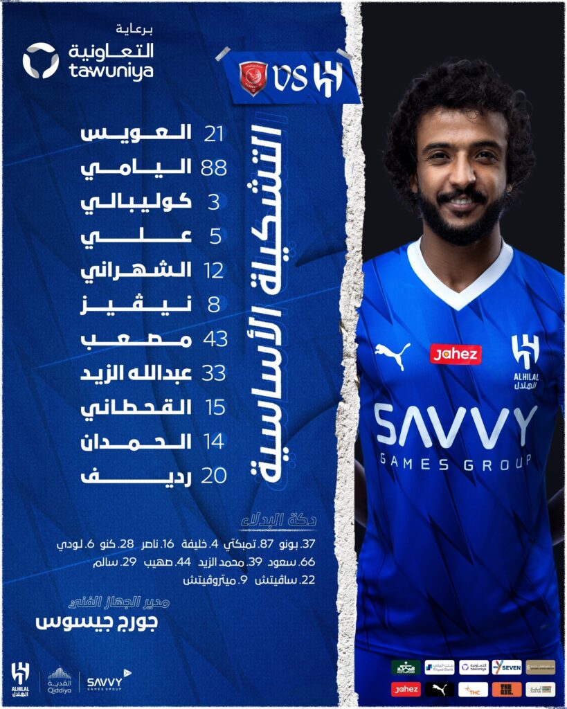 كشف المدرب البرتغالي جورجي جيسوس؛ المدير الفني لفريق الهلال السعودي، عن التشكيل الرسمي لمواجهة نظيره الدحيل القطري؛ في المباراة الودية التي تجمعهما مساء اليوم الأربعاء، ضمن استعدادات الزعيم لخوض منافسات الموسم الكروي الجديد 2024-2025.