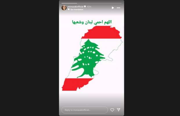 ونشرت منى زكي العلم اللبناني عبر خاصة «الاستوري» على موقع تبادل الصور والفيديوهات "إنستجرام"، قائلة: «اللهم احمي لبنان وشعبها».
