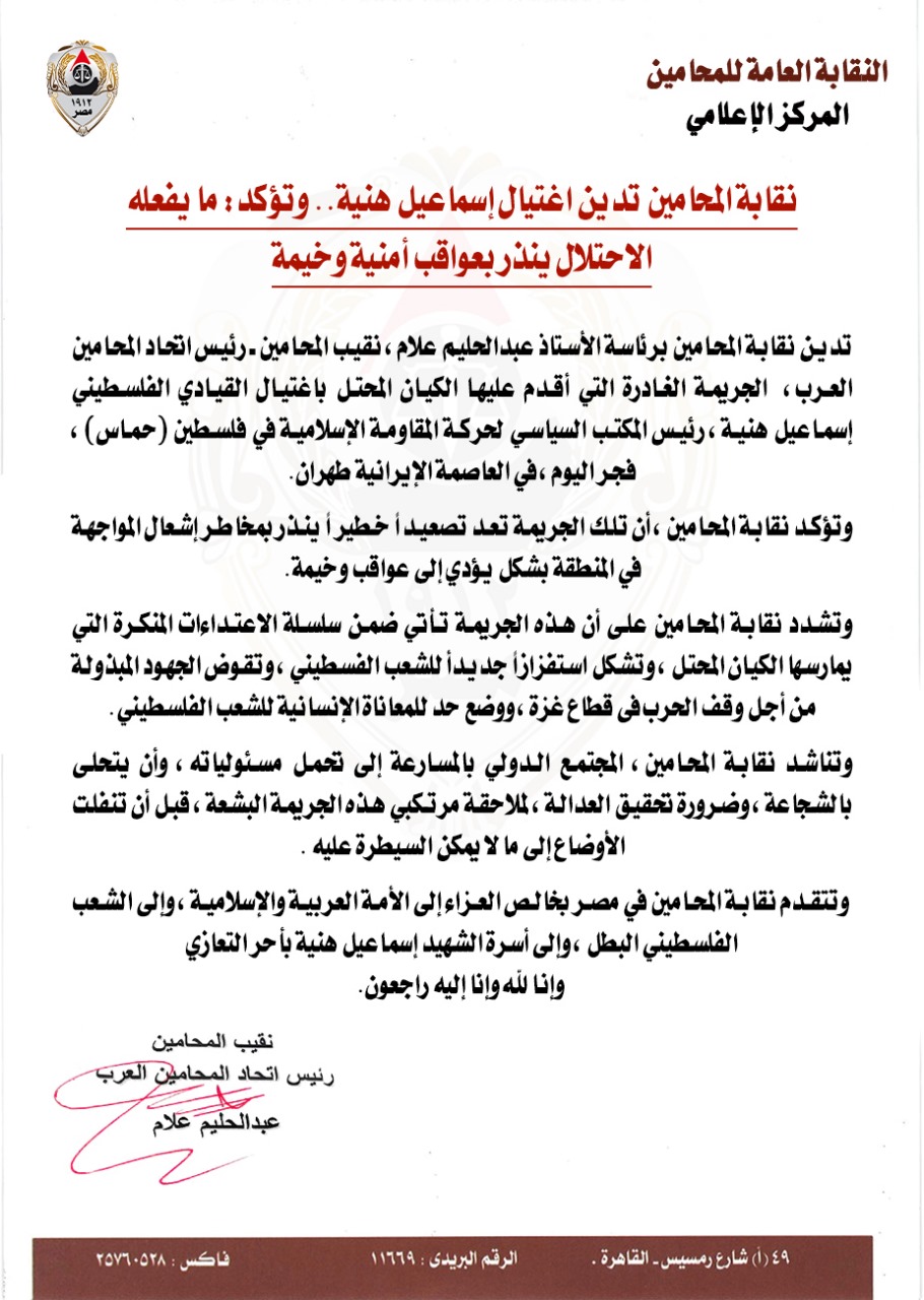 وتقدمت نقابة المحامين في مصر بخالص العزاء إلى الأمة العربية والإسلامية، وإلى الشعب الفلسطيني البطل، وإلى أسرة الشهيد إسماعيل هنية بأحر التعازي، وإنا لله وإنا إليه راجعون.