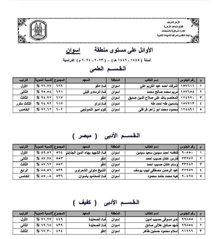 اسماء أوائل الطلبة الشعبة الأدبي بمعاهد أسوان الأزهرية :-