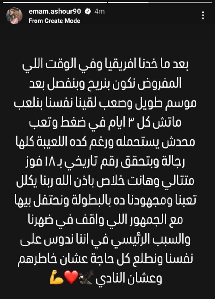 وكتب إمام عاشور عبر حسابه الرسمي على موقع التواصل الاجتماعي انستجرام: “بعد ما خدنا افريقيا وفي الوقت اللي المفروض نكون بنريح وبنفصل بعد موسم طويل وصعب لقينا نفسنا بنلعب ماتش كل ٣ ايام في ضغط وتعب محدش يستحمله ورغم كده اللعيبة كلها رجالة وبتحقق رقم تاريخي بـ ۱۸ فوز متتالي”.