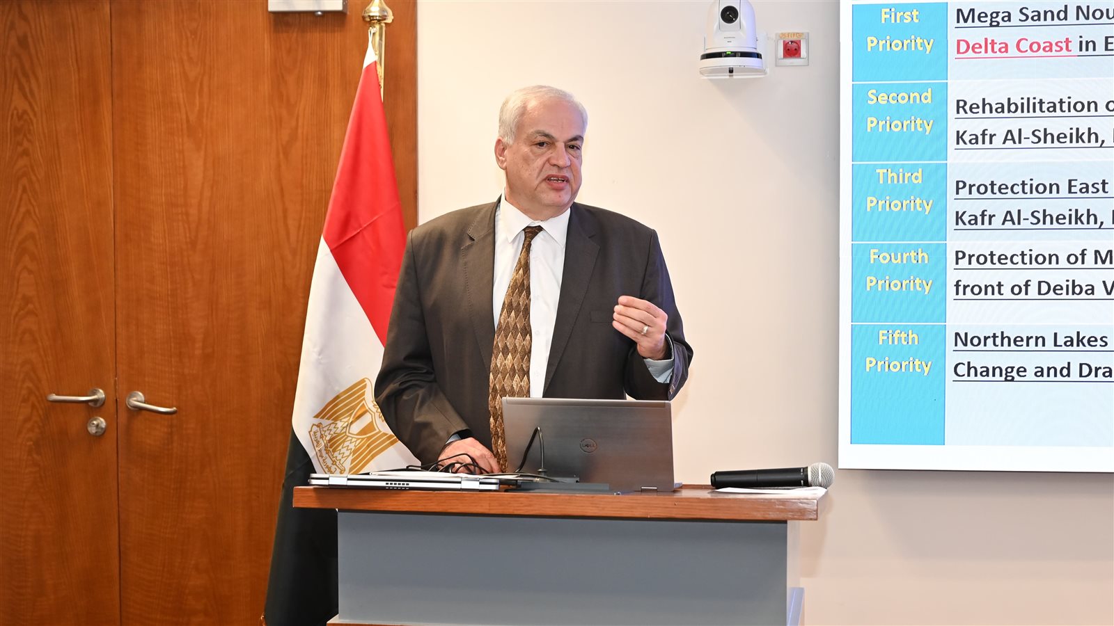 وخلال المناقشات.. تم الاتفاق على وضع عدد من الأولويات فى مجال التكيف مع تغير المناخ والتخفيف من آثاره من خلال عدد من المشروعات هى ( مشروع التغذية بالرمال على ساحل الدلتا - إعادة تأهيل حائط رشيد - حماية مصب مصرف كيتشنر - حماية ساحل بحيرة المنزلة أمام قرية الديبة - تنمية البحيرات الشمالية في ظل تغير المناخ وإعادة استخدام مياه الصرف الزراعي - المؤشرات البيئية لتقييم الأراضي الرطبة بالمناطق الساحلية - رصد وتقييم الاتزان الملحى بين المياه الجوفية ومياه البحر بشمال الدلتا - دراسة تأثير ارتفاع درجات الحرارة على تشغيل وصيانة محطات الرفع - دراسة تشغيل محطات الرفع في ظل ارتفاع منسوب سطح البحر - تقييم مخاطر الجفاف لتحقيق الإدارة المستدامة للمياه في مصر - نظام دعم القرار للتخفيف من آثار السيول وحصاد مياه الأمطار - تطوير خطة لإدارة الجفاف).
