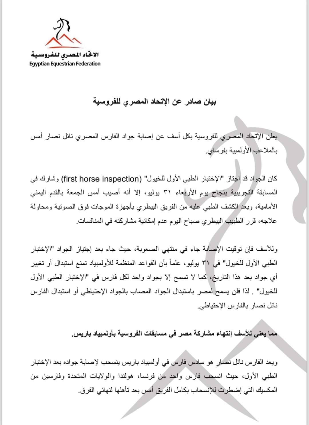 يعلن الاتحاد المصري للفروسية بكل أسف عن إصابة جواد الفارس المصري نائل نصار أمس بالملاعب الأولمبية بفرساي.