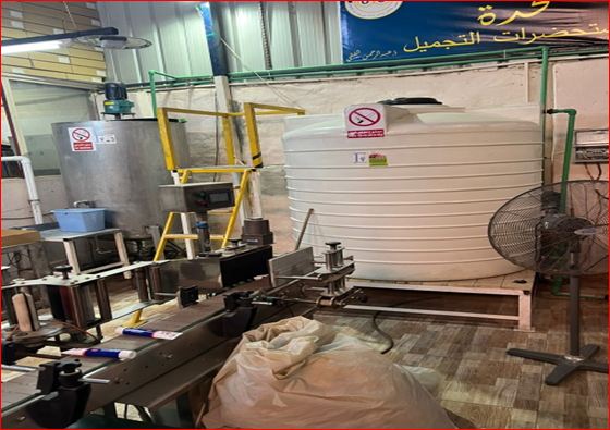 وعثر بداخل المصنع على(طن مادة خام "جيل" - 1164 عبوة معجون صابون مركز- 1700 عبوة جيل أشعة سونار- 1,800طن مادة خام لإنتاج المنظفات والجيل- 2 تنك بلاستيك مملوء بالماء- أدوات ومعدات التصنيع- كميات كبيرة من العبوات الفارغة).