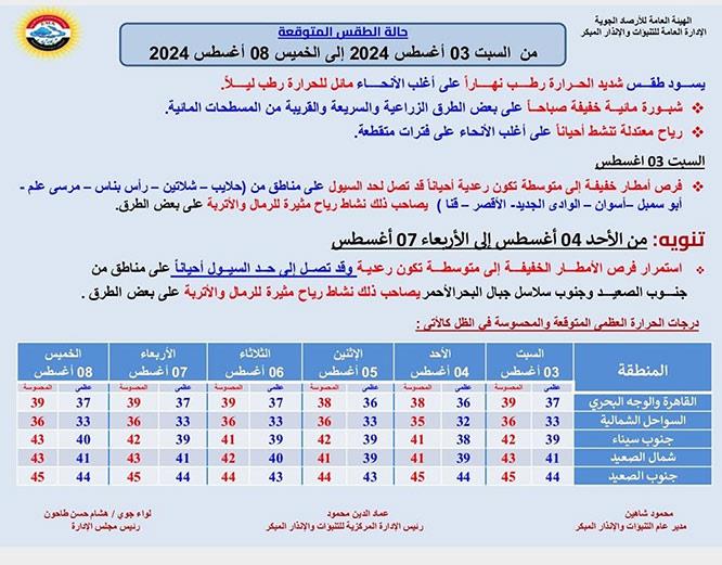 ولفتت الهيئة إلى أنه من يوم الأحد إلى الأربعاء، هناك فرص أمطار خفيفة إلى متوسطة تكون رعدية وقد تصل إلى حد السيول أحيانا على مناطق من جنوب الصعيد وجنوب سلاسل جبال البحر الأحمر يصاحب ذلك نشاط رياح مثيرة للرمال والأتربة على بعض الطرق.