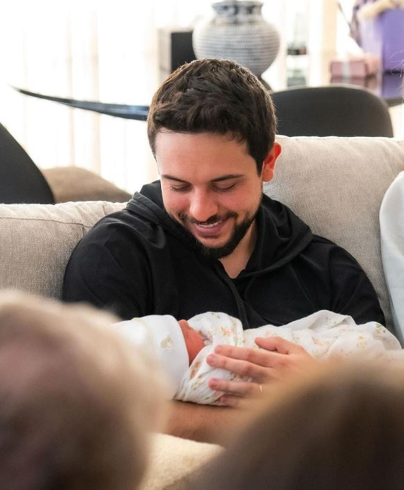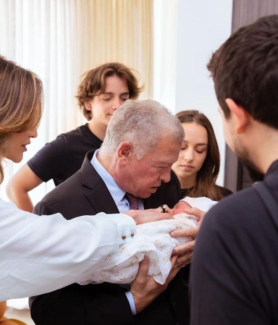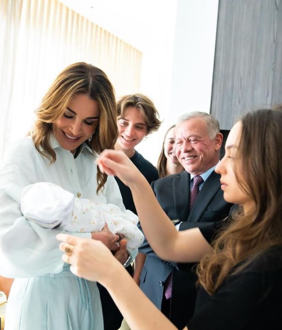 نشرت الملكة رانيا، ملكة الأردن، وزوجة عاهل الأردن الملك عبد الله الثاني بن الحسين الصور الأولى للعائلة الملكية الأردنية مع الحفيدة الأولى "إيمان"، ابنة الأميرة رجوة الحسين والأمير الحسين بن عبدالله.
