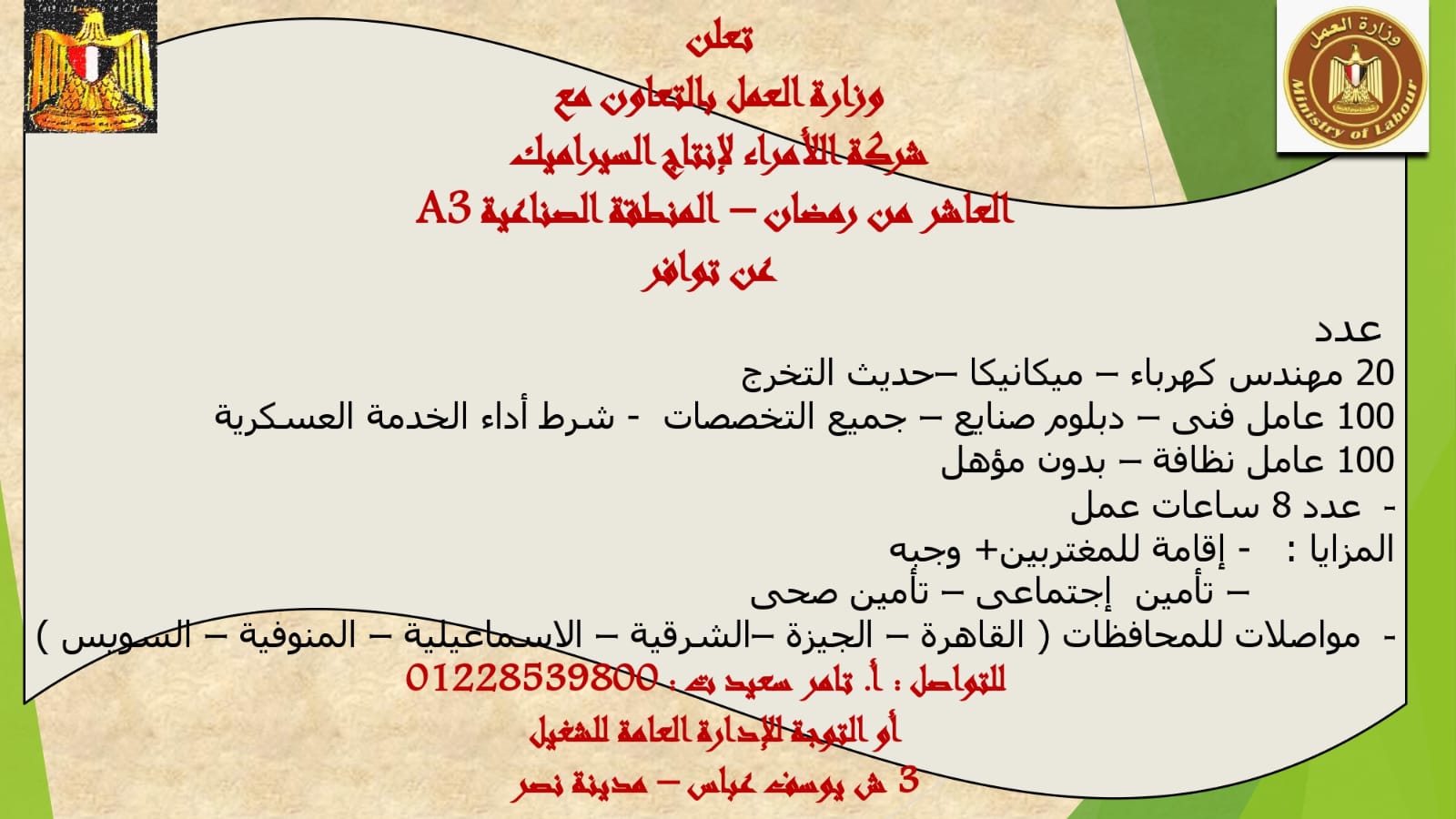 وللتواصل والاستفسار، والتقديم على رقم هاتف، مسؤولي الشركة : 01228539800، أو التوجه إلى مكتب الإدارة العامة للتشغيل "3 شارع يوسف عباس - مدينة نصر- وزارة العمل  ".