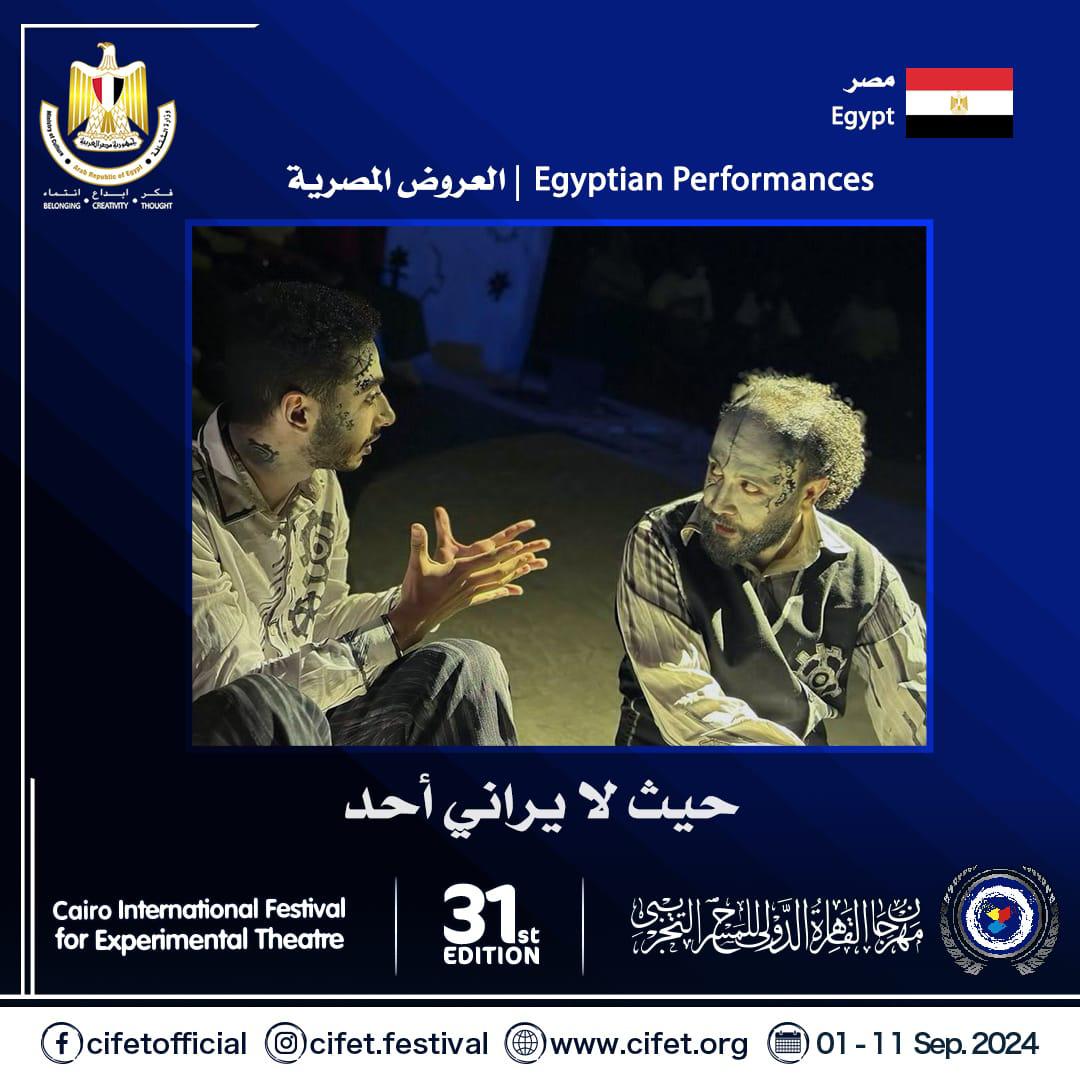 اختارت إدارة مهرجان القاهرة الدولي للمسرح التجريبي، برئاسة الدكتور سامح مهران، عرضين مسرحيين مصريين ليشاركا في الدورة الـ 31، وهما : "ماكبث المصنع "، إنتاج كلية طب أسنان جامعة القاهرة ، وإخراج محمود الحسيني، وعرض" حيث لا يراني أحد"، إنتاج المعهد العالي للفنون المسرحية، و إخراج محمود صلاح محمد عطية.