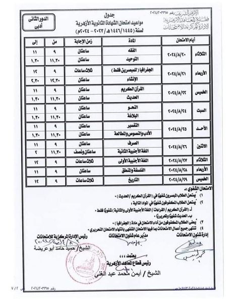 اعتمد قطاع المعاهد الازهرية بمحافظة القليوبية، جداول الشهادة الثانوية الأزهرية ( علمى - أدبى )، الدور الثاني للعام الدراسي ٢٠٢٤/٢٠٢٣ م .