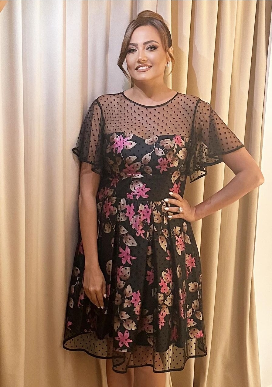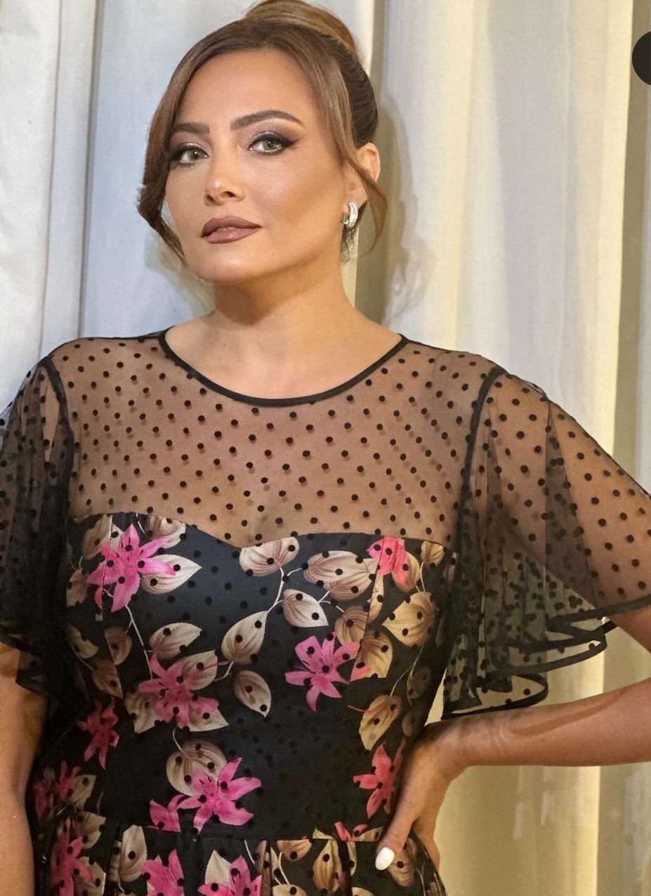 وبدت بشرى بإطلالة ناعمة، حيث ارتدت فستان قصير مجسم من اعلى وفضفاض من أسفل، بنصف كم، ببطانه مشجره وعليه التل البارز لتعكس أناقتها.