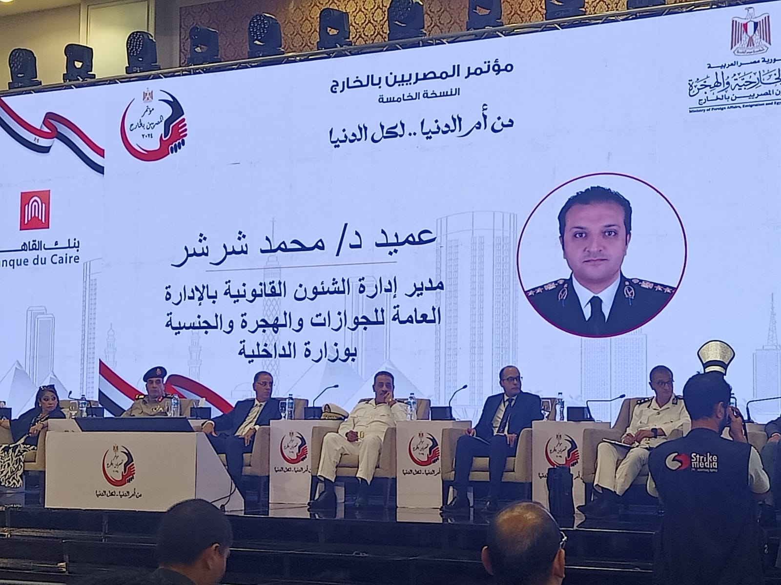 شارك العميد الدكتور محمد شرشر، مدير ادارة الشئون القانونية بالادارة العامة للجوزات والهجرة والجنسية بوزارة الداخلية، في جلسة الخدمات المقدمة للمصريين في الخارج بمؤتمر وزارة الهجرة والخارجية المنعقد الان باحدى فنادق القاهرة.