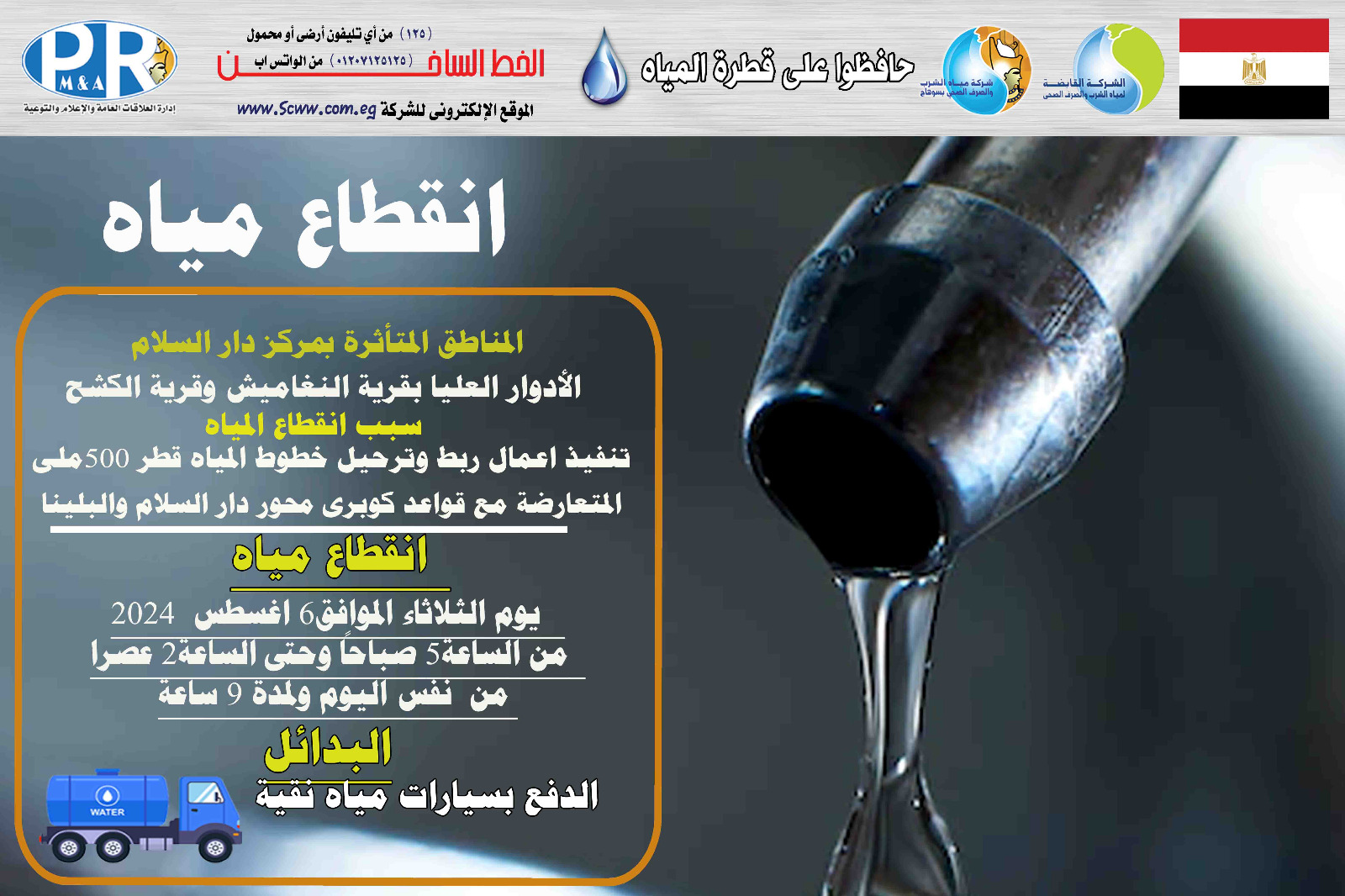 غدًا: انقطاع المياه بمركز دار السلام بسوهاج للصيانة