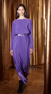 واحضرنا لكٍ مثال من دور الأزياء العالمية وهو الفستان الأرجواني طويل الأكمام والمزين بشق قصير على الجانب والمزود بحزام من نفس لونه من مجموعة ماركة ألكسيس مابيل Alexis Mabille، لمزيد من الأناقة نسِّقيه مع حذاء مدبب أسود مزود بإبزيم يلف الكاحل، واحملي حقيبة صغيرة سوداء مبطنة ومزودة بسلسال فضي طويل، وزيني اذنيك بأقراط الـHoops الكبيرة المصممة من الفضة أو الذهب الأبيض.