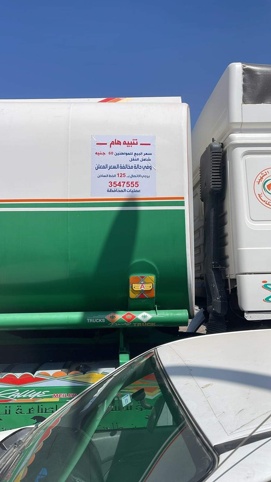 كما صدر قرار المحافظ، وفقا لتوصيه شركة المياه بتحديد سعر نقل المياه الذي يتم بيعه للمستهلك من السيارات الخاصة بحد أقصى ستون جنيها للطن شاملة سعر الشراء من الشركة والنقل - ويتم وضع استيكر لاصق على السيارات المتعامل معها مدون عليه سعر البيع للمستهلك وتوقيع غرامة ١٠ آلاف جنيه على المخالفين.