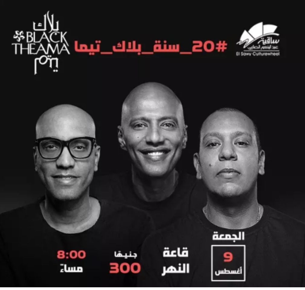 يستعد فريق بلاك تيما، لاحياء حفلًا غنائيًا بساقية عبدالمنعم الصاوي، وذلك الجمعة الموافق 9 أغسطس الجاري، في تمام الساعة الثامنة مساء بقاعة النهر، وسعر التذكرة 300 جنيها.