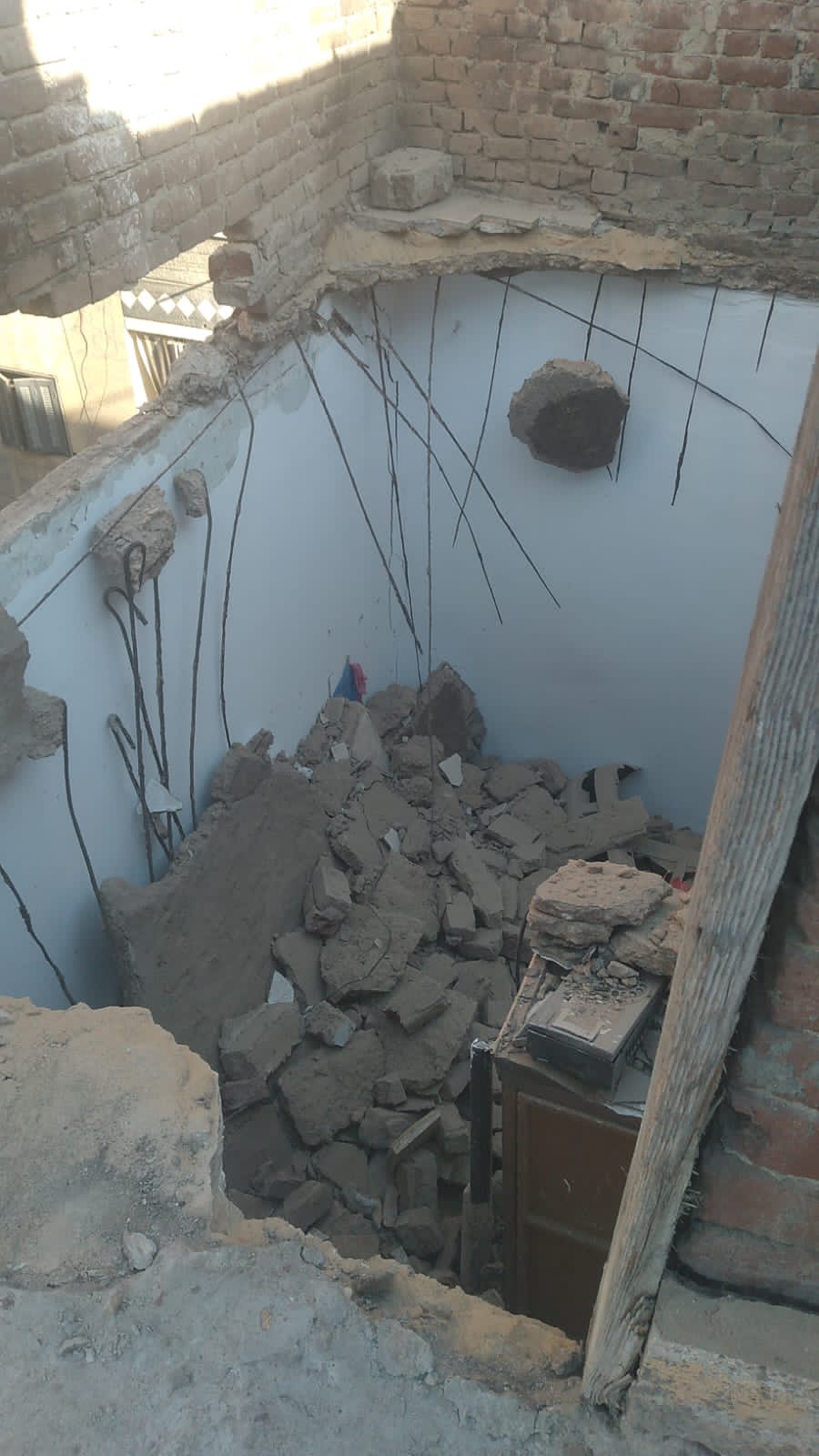 وتبين أن المنزل مكون من ثلاث طوابق كل طابق مكون من شقتين والدور الثالث مكون من شقه واحده والجزء المنهار من الدور الثاني ليس فوقه اي مباني.