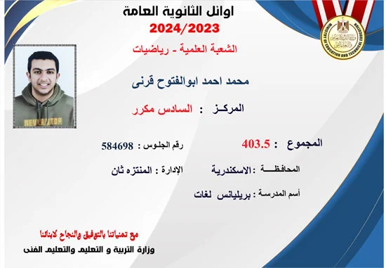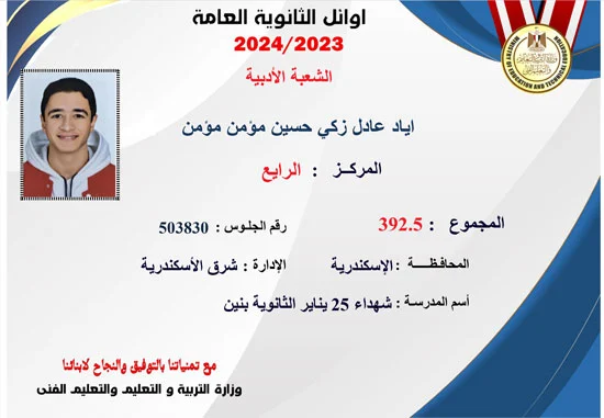 والطالب اياد عادل زكى الحاصل على المركز الرابع بمجموع 392.5 عن الشعبة الادبية ، كما حصل على المركز السادس مكرر الطالب محمد احمد أبو الفتوح قرني - مجموع 403.5 .
