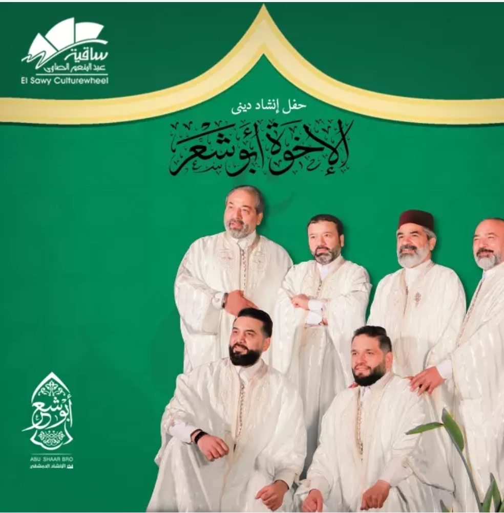 تستقبل ساقية عبد المنعم الصاوي، حفل إنشاد ديني لفرقة الإخوة أبو شعر، مساء يوم الجمعة المقبل ٩ أغسطس الجاري، في تمام الساعة السابعة مساء.