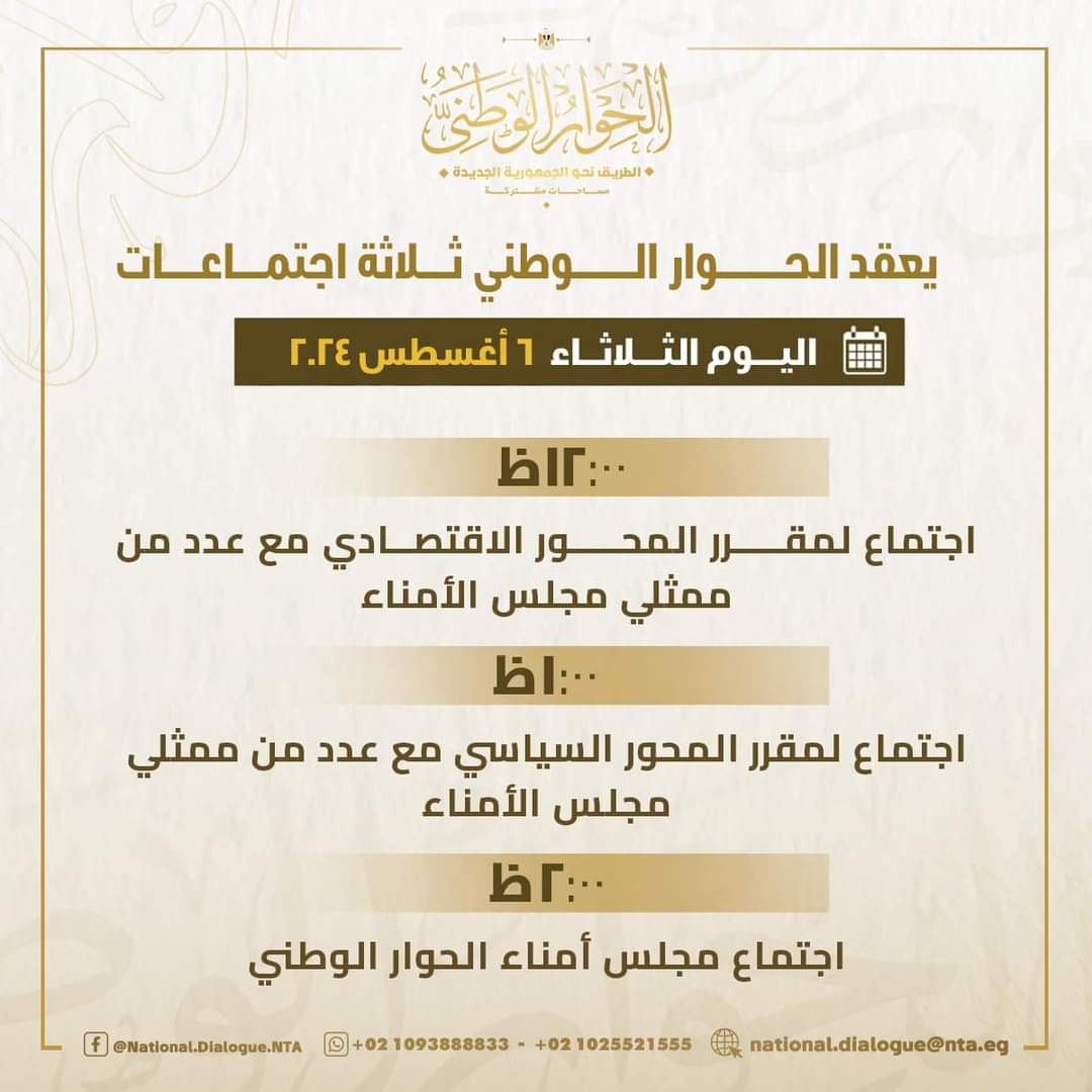 كما يجتمع مجلس أمناء الحوار الوطني لمناقشة نتائج اجتماعات المحاور، وأخذ اللازم من ترتيبات فيما يخص عقد جلسات قضية الدعم وجدول أعمالها، وفيما يخص الحبس الاحتياطي واعتماد توصياته النهائية التي سيتم رفعها للسيد الرئيس عبد الفتاح السيسي.