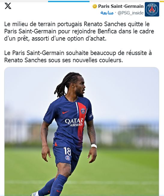 وقال نادي باريس سان جيرمان في بيانه الذي نشره: “غادر لاعب الوسط البرتغالي ريناتو سانشيز نادي باريس سان جيرمان الفرنسي للانضمام إلى بنفيكا على سبيل الإعارة مع خيار الشراء، يتمنى باريس سان جيرمان كل النجاح لريناتو سانشيز بألوانه الجديدة”.