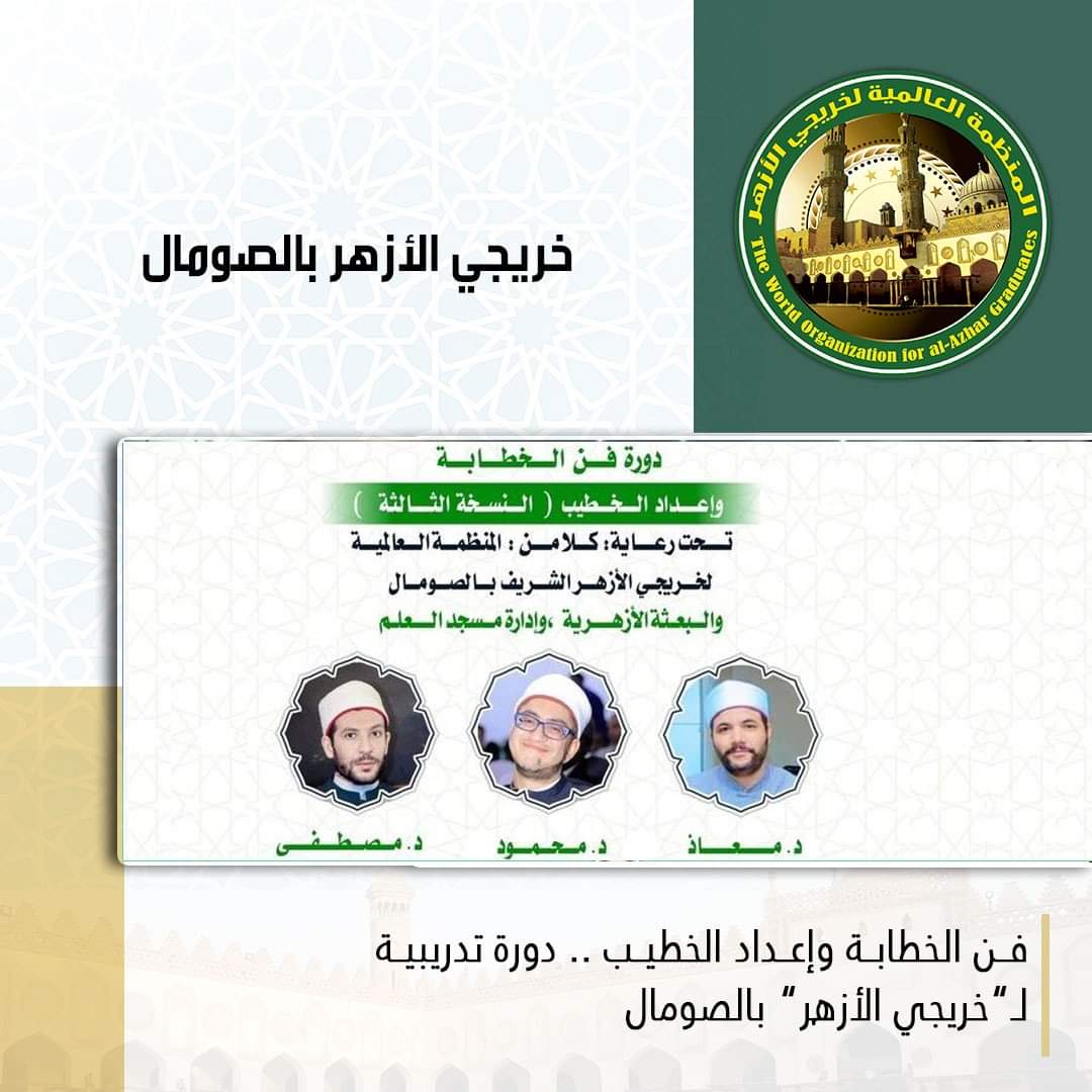 عقد فرع المنظمة العالمية لخريجي الأزهر بقرضوا – الصومال، دورة “فن الخطابة وإعداد الخطيب” بالتعاون مع البعثة الأزهرية المصرية بدولة الصومال، بمسجد العلم بمدينة قرضو.